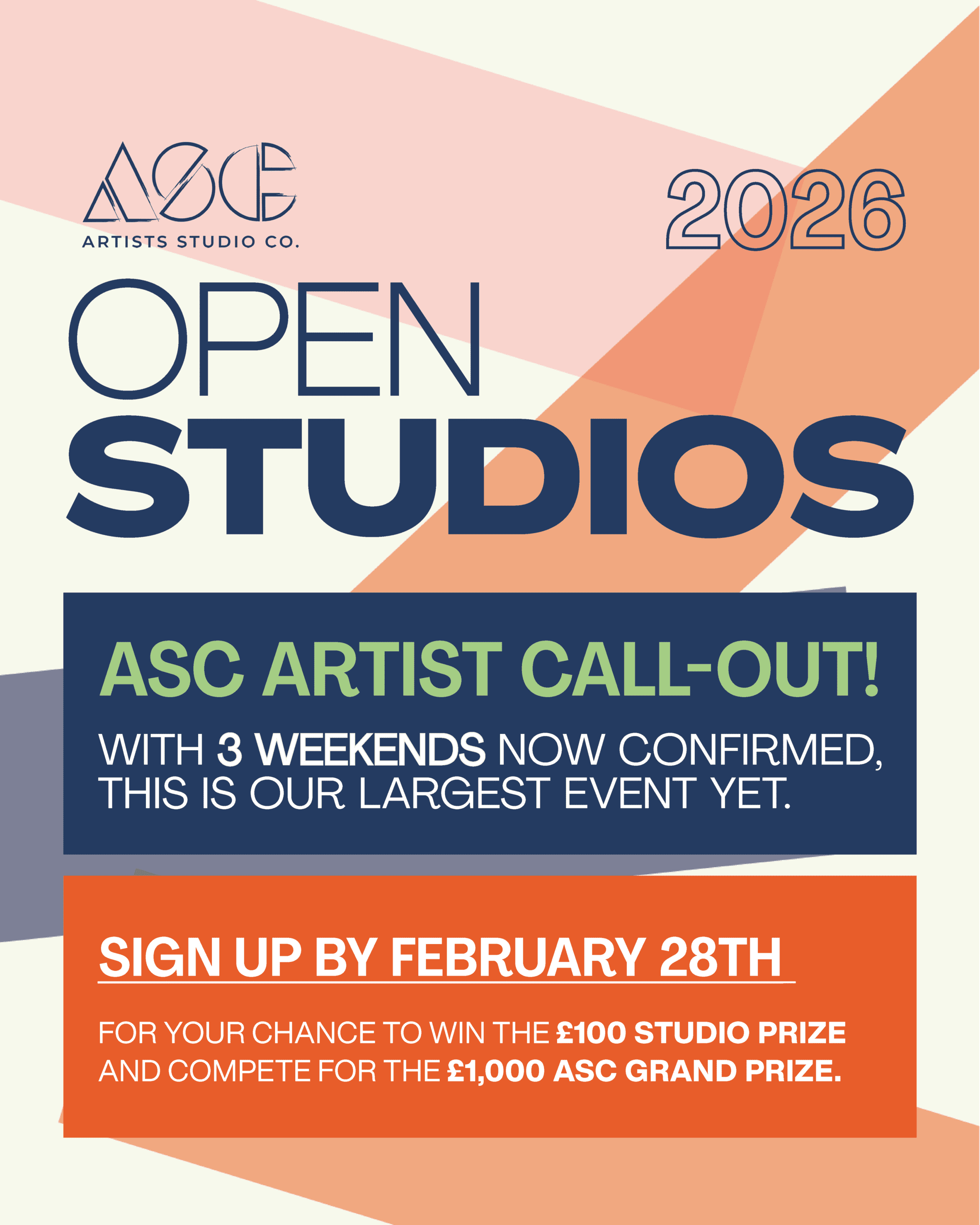 - An ASC Studio artist from each building will be chosen to go into an August Summer Exhibition at ASC Gallery at The Handbag Factory where a 1st prize of £1000 is up for grabs. Each chosen studio artist will also receive a £100 Arts material voucher. We are actively looking for other sponsors for more awards similar to our Pearlescent Anniversary event in 2025.
